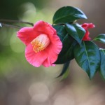 - 元気なツバキです。背景のボケもキレイなグリーンとタマボケがとてもキレイです。ただ、右の葉が多すぎます。チラッと覗いている赤い花の所から切り取ると良くなります。
