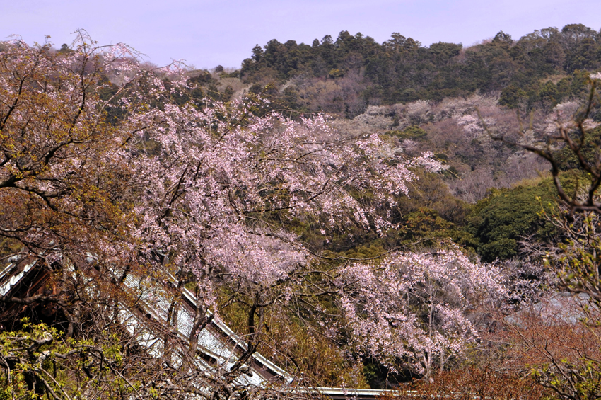 - お寺のお社の屋根の一部を左に入れてシダレサクラが写っているのですが、少々ごちゃごちゃしています。また、サクラの色を出そうとして画像調整をしたのですがマゼンタを上げすぎてカブリが出ています。