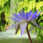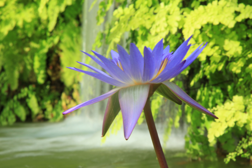 - 温室のスイレンです。後ろに滝が流れていてジャングルの雰囲気が良く出ています。茎の長い熱帯のスイレンのため花と風景がバランスよくまとまっています。シャッター速度もスローになっていて滝の流れがいい具合に流れています。