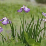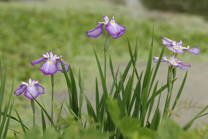 - 水際に咲く花菖蒲を背景に水草、手前に葉を入れてワイルドな表現になっています。あるがままのワイルドな表現もいいですね。