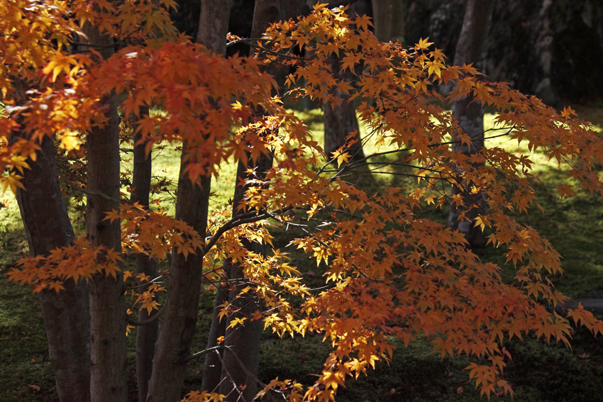 - 日陰のモミジです。いい枝振りのモミジを見つけました。画面構成はいいのですが露出を補正せずに撮ったためモミジが暗くなってしまいました。この時はプラス補正をして手前を明るくします。背景がもっと明るくなりますがそのままでOKです。
