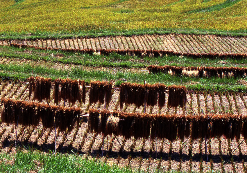 - 大山千枚田の風景です。挟掛けの風景を逆光を使って印象的に表現しています。のどかな残しておきたい日本の原風景です。画面上部に実った稲穂ほ入れたことがこの画面に変化を付けています。