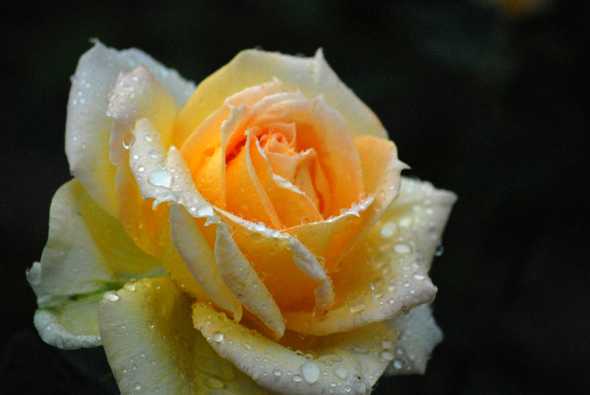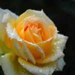 - 水滴のついたキレイなバラです。撮影していて雨が降って来たらラッキーと思って下さいこんな素敵な写真が撮れるのです。背景を暗くして花を引き立たせています。大成功です。