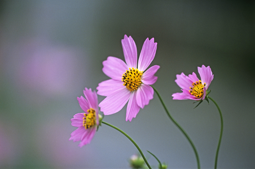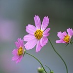 - やさしいピンクのコスモスをやさしいグレーの背景でまとめています。またぼけが効果的な大きさと配置で実にいい写真です。