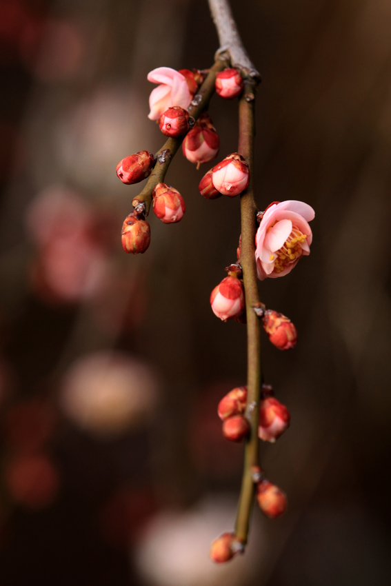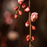 - シダレのウメですが花のついている枝が少々太いです。また光が強いのでコントラストが強くたくましい花になってしまいました。