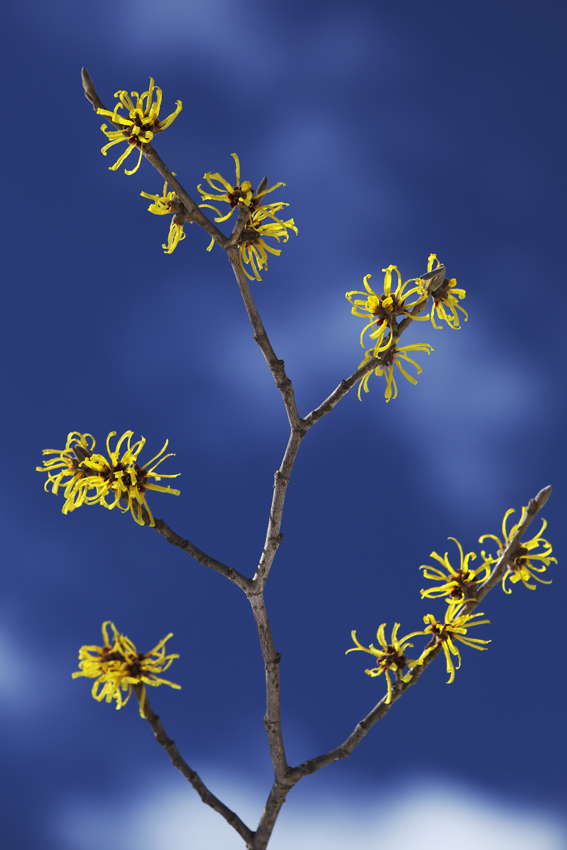 - 枝振りのいいマンサクが青空に映えていました。青空一色の背景だと少々寂しいので雲を待ちました。