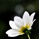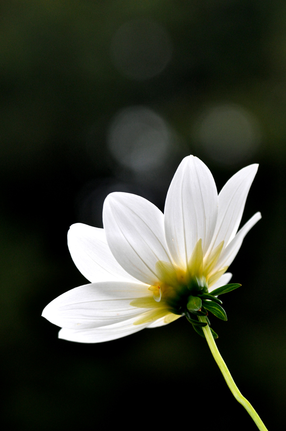 - 逆光で透ける白いダリアを花の裏側から撮っています。背景を黒にしたために花が浮かび上がっています。暗い中に玉ボケが効果的です。