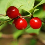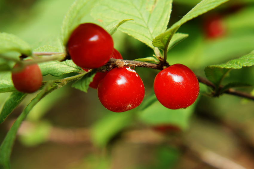 - ニワウメ?ユスラウメ?どちらかだと思いますが美味しそうな実です。ウメが咲いた後に実ります。背景の葉が少々邪魔です。枝が飛び出したのを狙います。