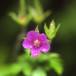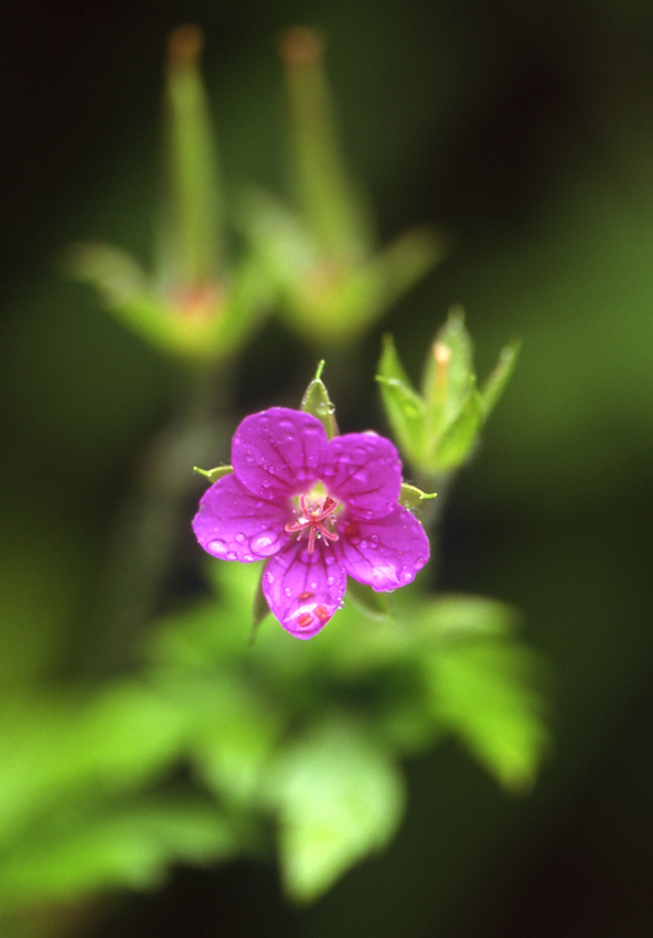 - 水滴のついたゲンノショウコ、背景にタネになる前のサヤが形良く入っています。また、下の葉が形良く入っていていいアクセントになっています。上手くまとまっています。