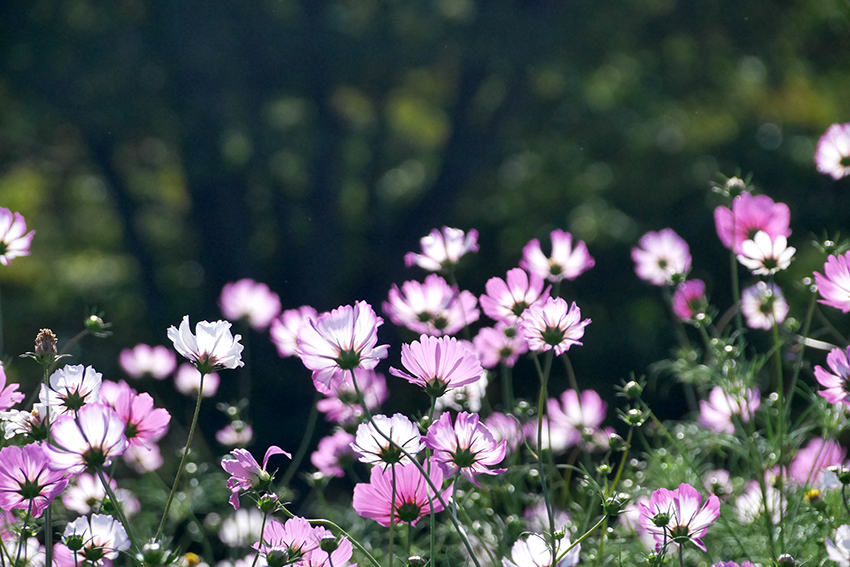- 午後の光でコスモスたちが輝いています。光の中ではしゃいでいる声がザワザワと聞こえてくるようです。この画面の中にドラマがあるようでよく見つけました。
