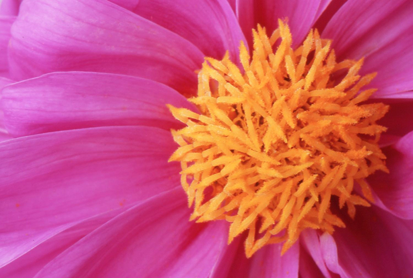- 花芯のシベがとてもキレイです。ピンクと黄のコントラストがキレイです。絞りを思いっきり絞ってシャープに表現しています。これが成功のポイントです。