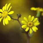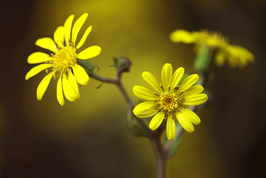 - 若い株のツワブキです。枝の張り方が形が良く変化のあるツワブキを撮りました。また背景に同じ花のボケが入る様にカメラ位置を微妙に調整して花の後ろに配置しました。