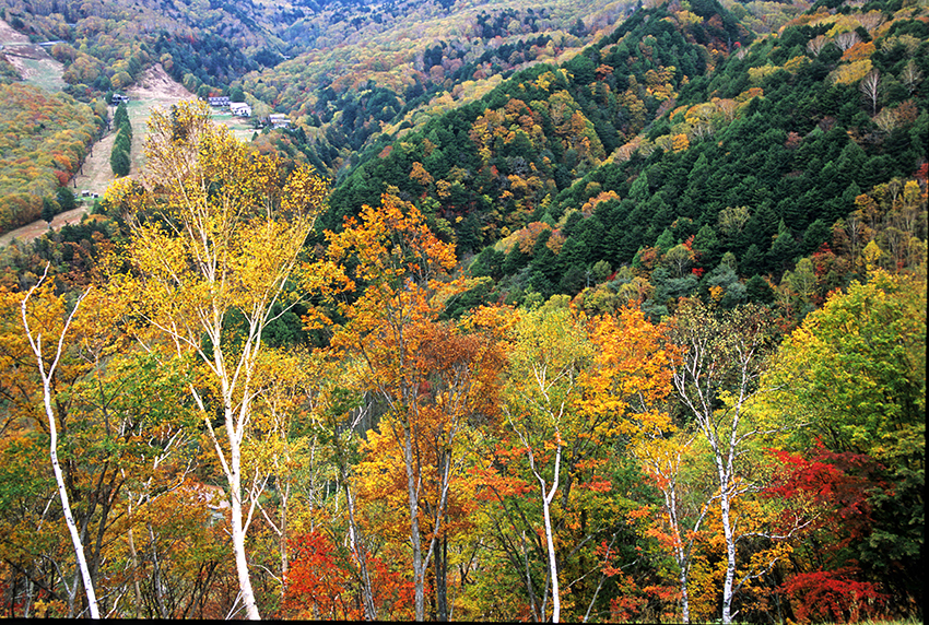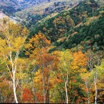 - 山の紅葉を遠近感をつけてダイナミックに表現しています。右下の紅葉した紅が画面にアクセントをつけて画面を引き締めています。絞りを思いっきり絞って遠くの風景もきっちり写っています。