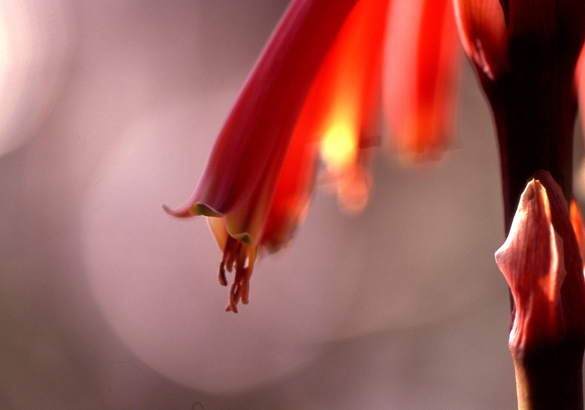 - アロエの花の先端です。背景の色と花の色が同系色で玉ボケの中に花を置いて良く考えてまとめています。