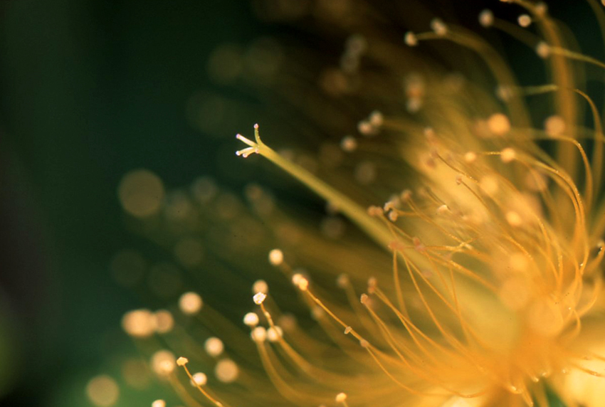 - ビヨウヤナギの花芯にピントを合わせ絞り開放で背景のボケをキレイにまとめています。暗い背景が成功のポイントです。