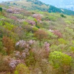 - ロープウエイのゴンドラのからの新緑と山桜です。この時期の山のみどりは階調があって実にキレイです。ゴンドラからもこんな風景が撮れるのですね。