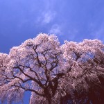- 姿のいいシダレザクラです。その樹の勢いを見せるため広角で全体の姿を青空を入れて撮りました。青空だけでは寂しいので雲を待って撮ったそうです。アクセントになっています。