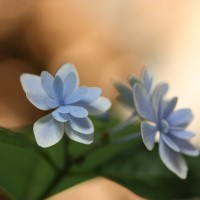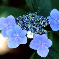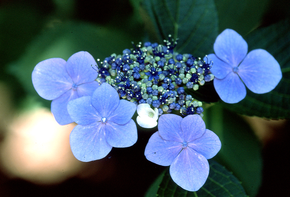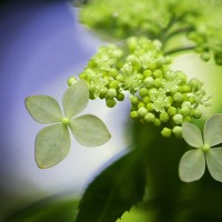 - 009講師 宮本和義清楚に咲くヤマアジサイです。青いタマアジサイを背景にボケとして生かしています。