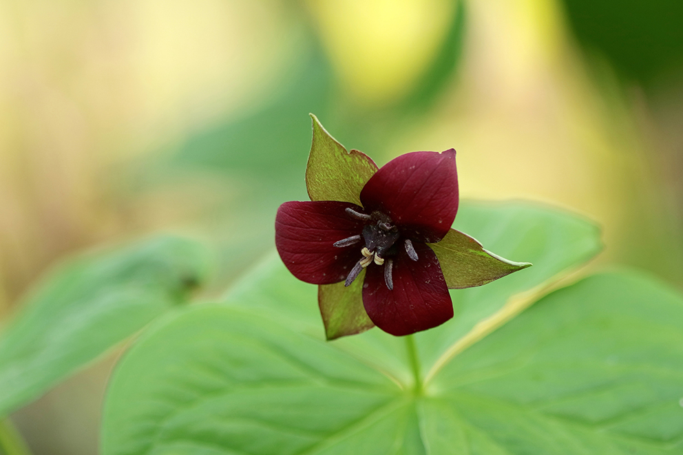 - 006中村嘉子大花のエンレイソウ写真になりますね。背景のボケもうまく取り込みました。葉を大きく入れていいです。