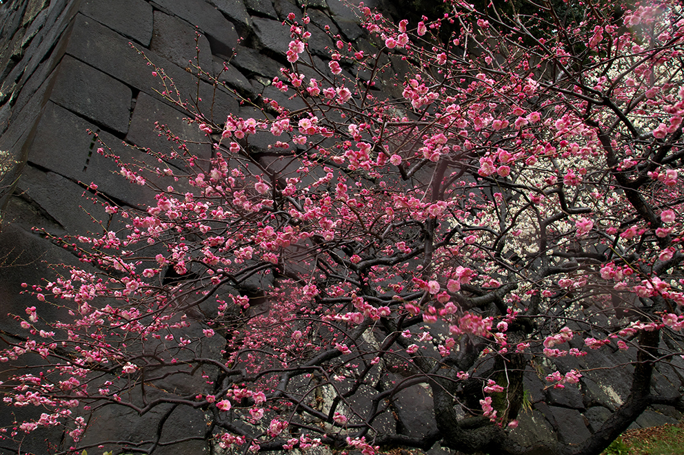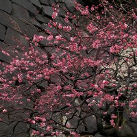 - 011講師 宮本和義 皇居の梅です。雨で濡れた石垣がいい背景になっています。