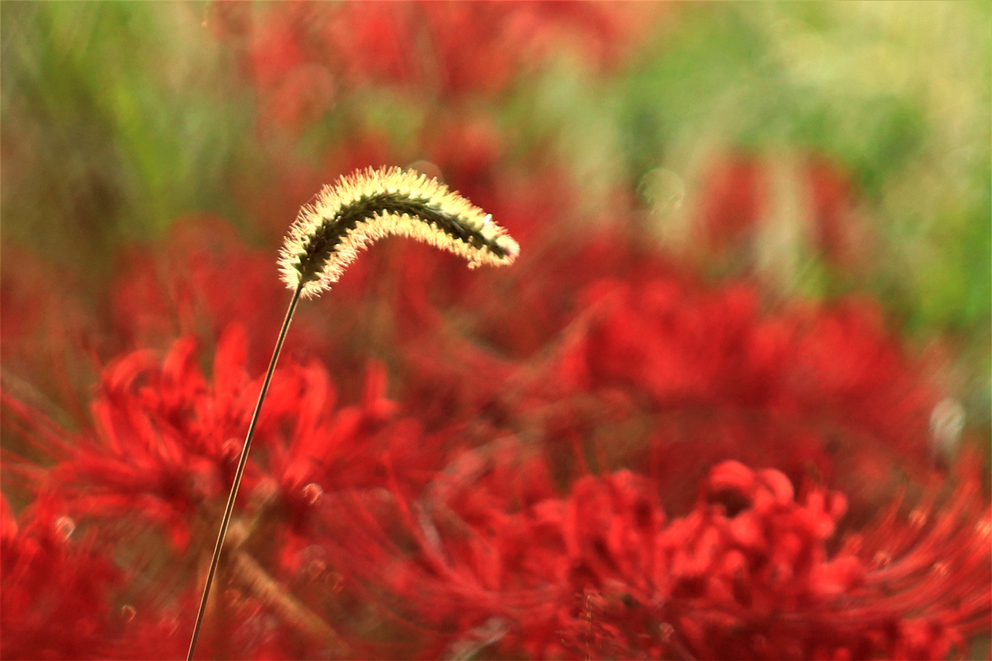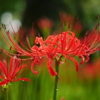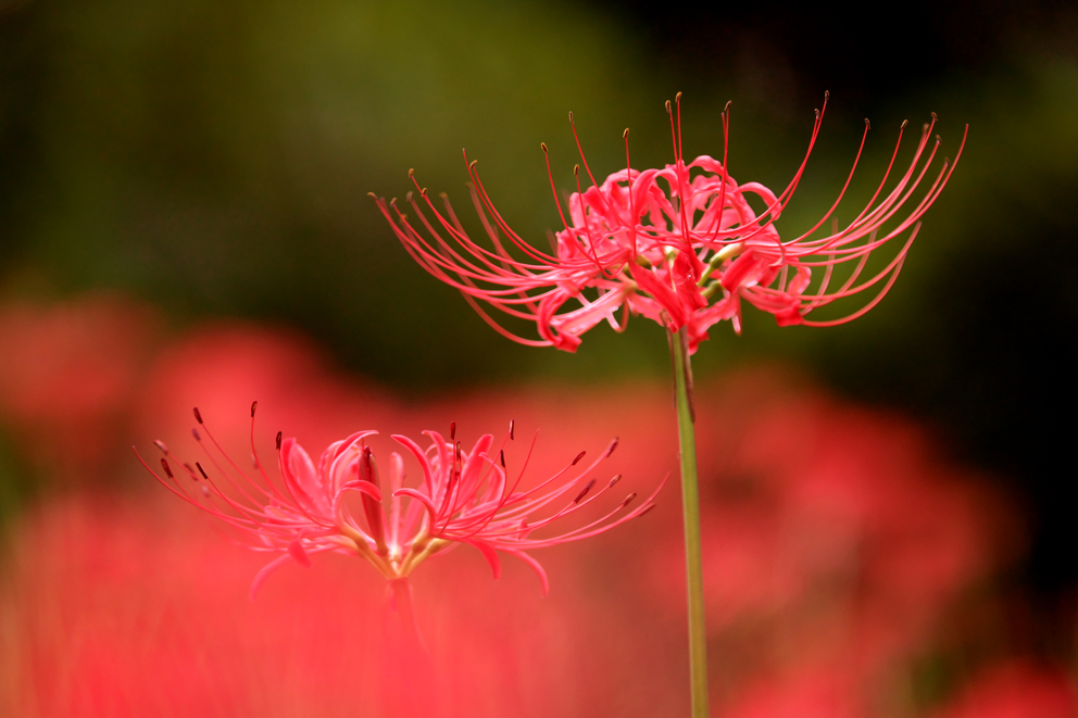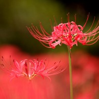 - 012講師 宮本和義 ボケの中のヒガンバナと暗い背景に明るいヒガンバナ変化をつけました。