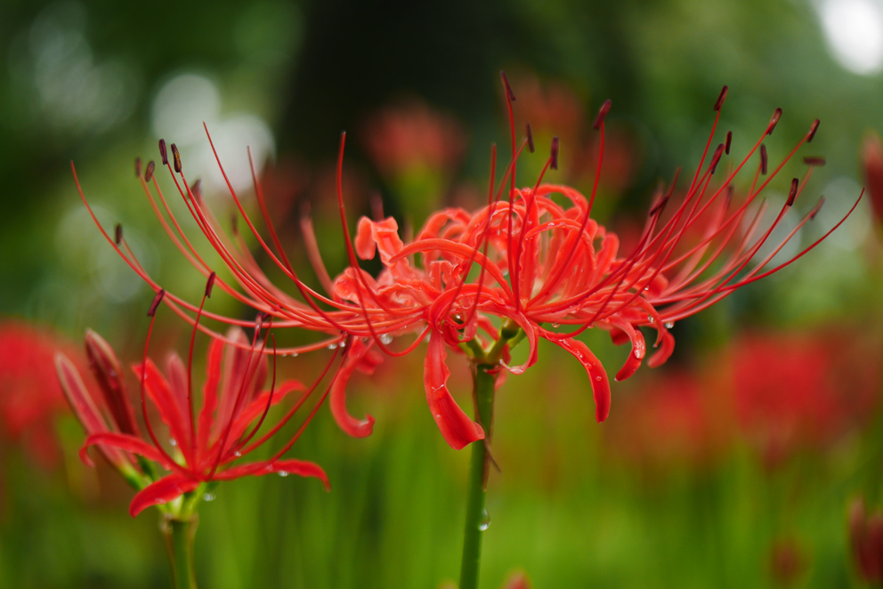 - 008丹沢広子 水滴のヒガンバナしっとりといい雰囲気が出ています。カメラの高さも花と同じでいい背景にっています。