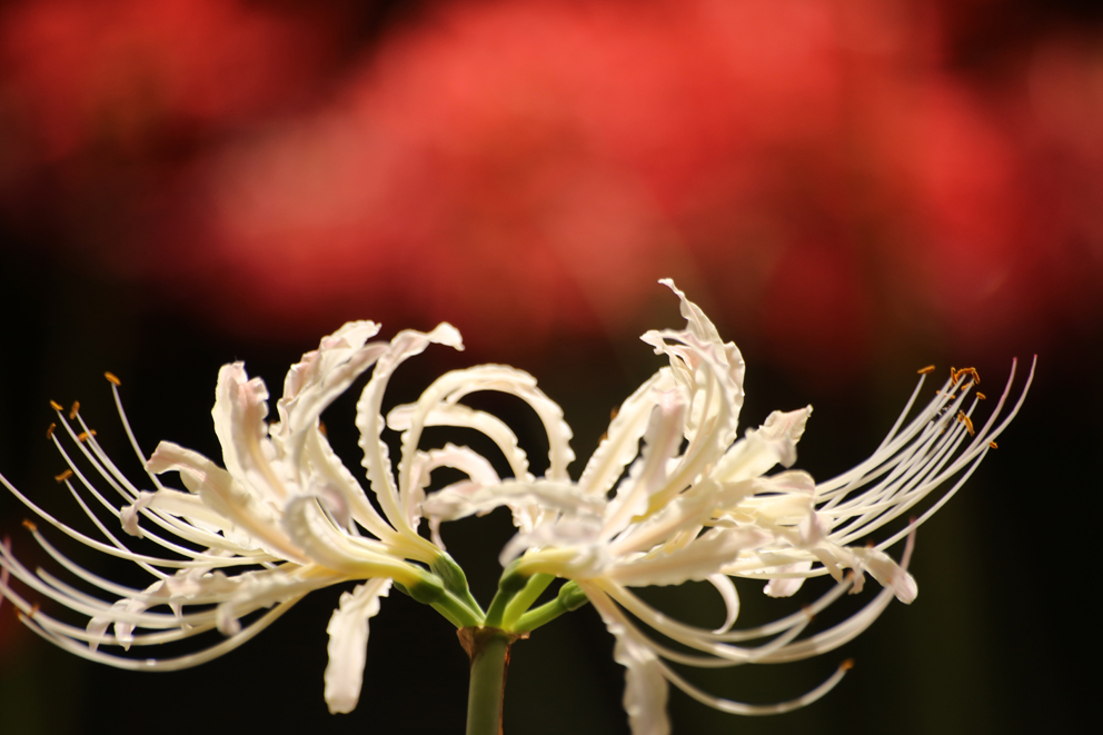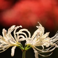 - 004栗原英子 白いリコリスを背景の赤と匠の取り合わせです。