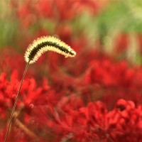 - 010堀内直子 真っ赤な背景の前に光るエノコログサ一輪、印象の強い作品です。