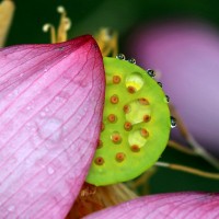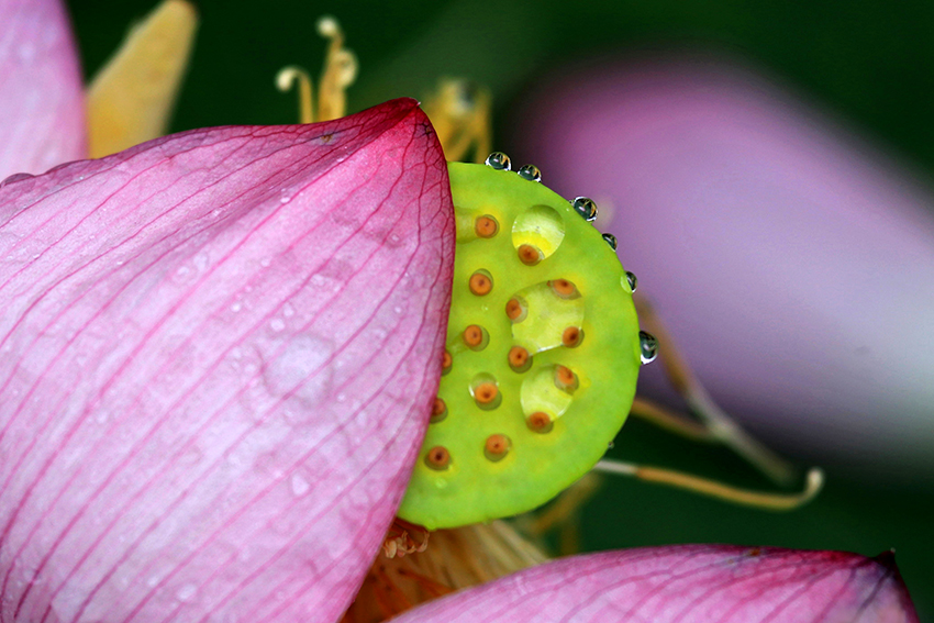 - 008堀内直子 ハスの蜂巣の縁に着いた水滴が光っています。良く見つけました。
